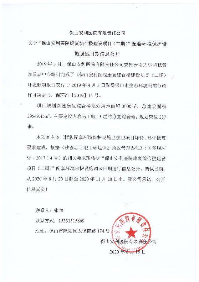 保山安利醫(yī)院康復(fù)綜合樓建設(shè)項目(二期)環(huán)保驗收第二次公示